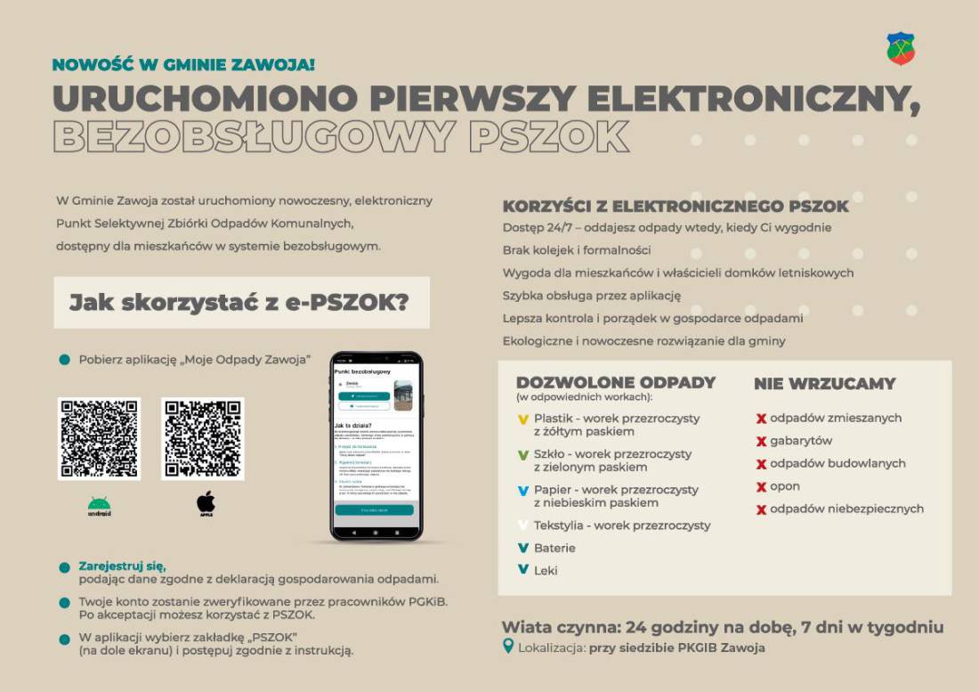 Gmina Zawoja – uruchomiono elektroniczny, bezobsługowy e-PSZOK.Mieszkańcy Gminy Zawoja mogą już korzystać z nowoczesnego rozwiązania w zakresie gospodarowania odpadami. Przy siedzibie PGKiB Zawoja uruchomiono pierwszy elektroniczny, bezobsługowy Punkt Selektywnej (...) 02.03.2026 0 0