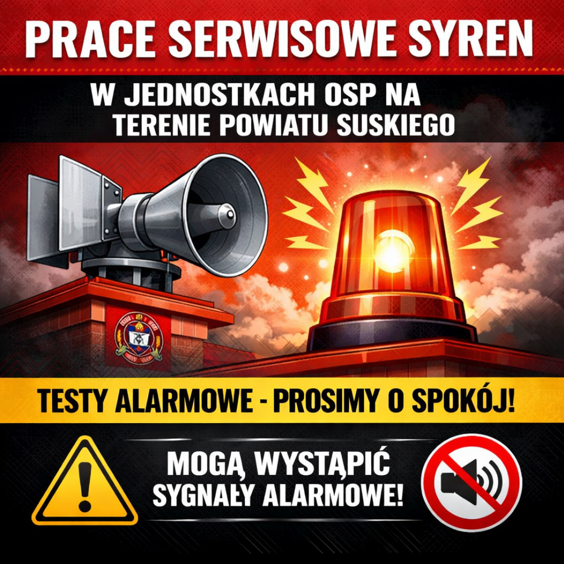 Uwaga! Może dochodzić do krótkotrwałych uruchomień syren alarmowych – trwają prace serwisowe.W związku z trwającymi pracami serwisowymi przy syrenach ostrzegawczych w jednostkach Ochotniczych Straży Pożarnych na terenie powiatu suskiego, Komenda Powiatowa Państwowej Straży Pożarnej informuje (...) 19.02.2026 0 0