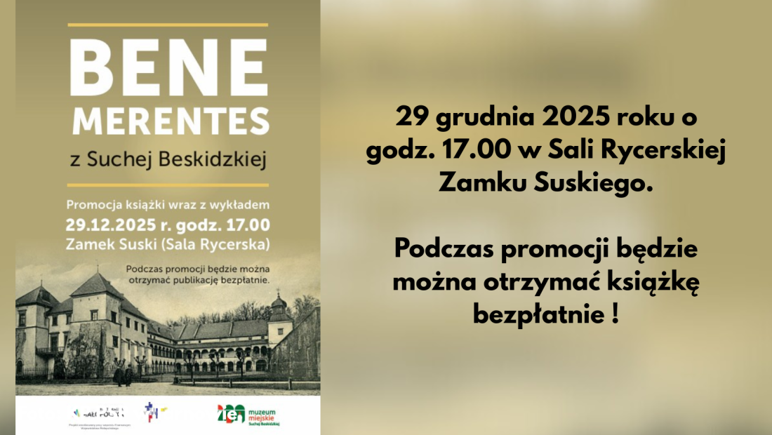 Promocja publikacji „Bene Merentes z Suchej Beskidzkiej” w Zamku Suskim.Muzeum Miejskie Suchej Beskidzkiej oraz Stowarzyszenie Europejski Instytut Rozwoju Regionalnego zapraszają mieszkańców regionu na wyjątkowe wydarzenie kulturalne – promocję publikacji (...) 20.12.2025 0 0