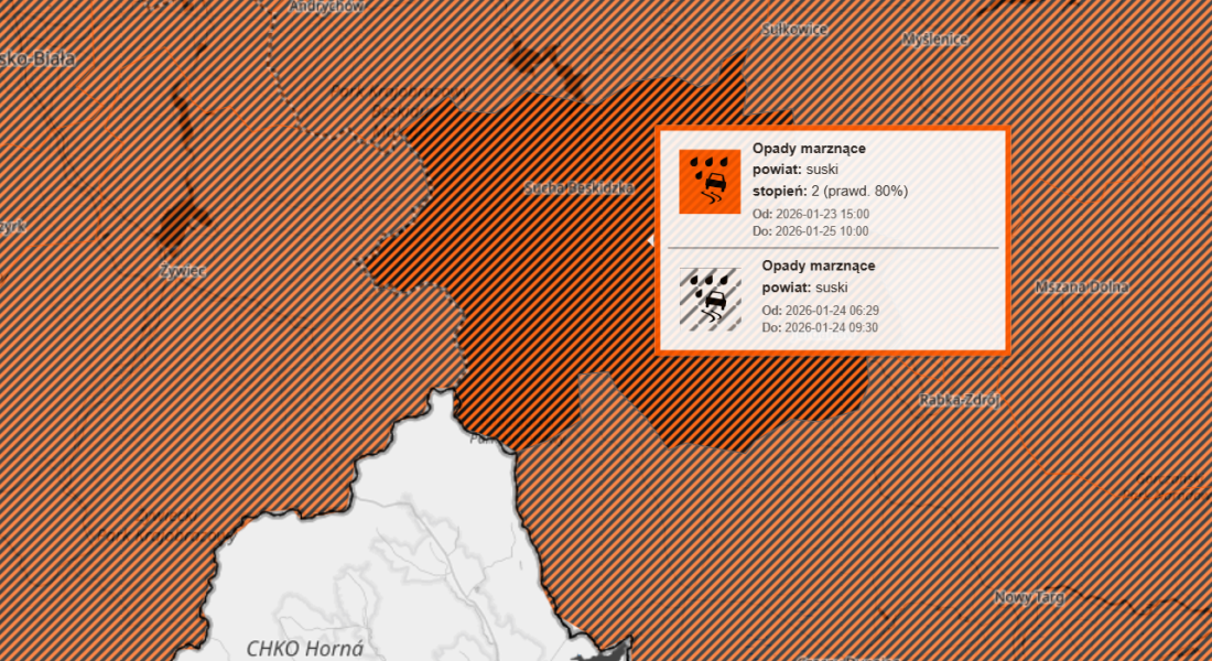 Opady marznące w powiecie suskim. IMGW wydał ostrzeżenie drugiego stopnia.Mieszkańcy powiatu suskiego powinni przygotować się na trudne warunki pogodowe. Instytut Meteorologii i Gospodarki Wodnej wydał ostrzeżenie meteorologiczne drugiego stopnia dotyczące opadów (...) 23.01.2026 0 0