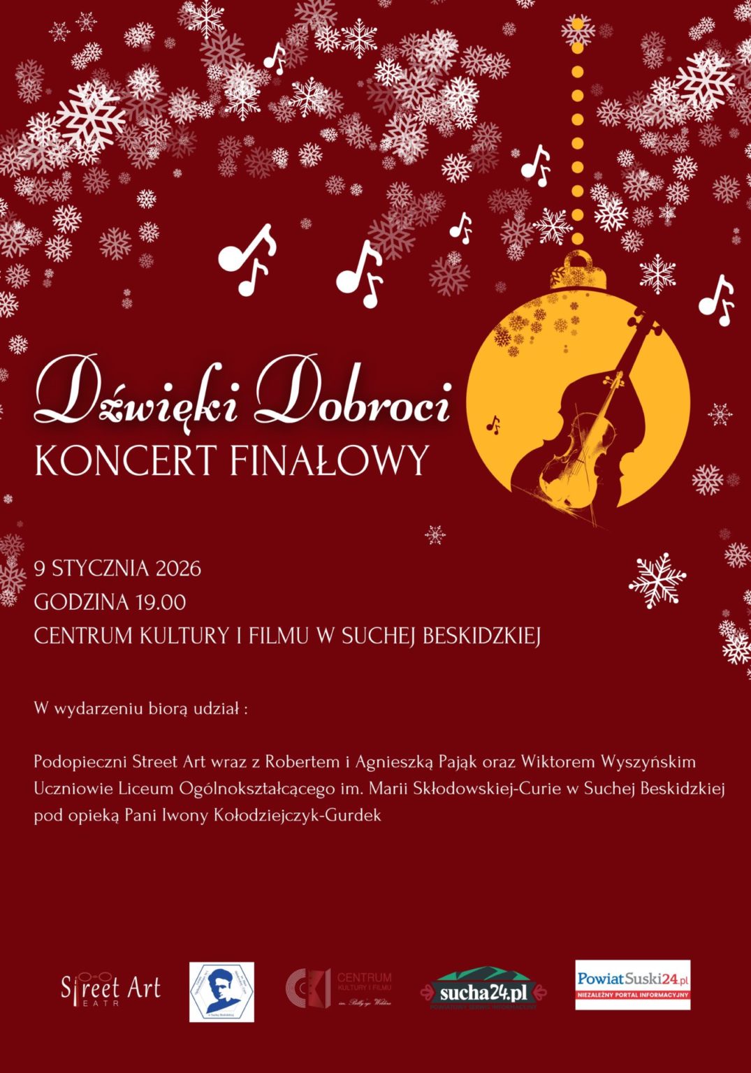 Podopieczni Street Art oraz uczniowie Liceum Ogólnokształcącego nr I im. Marii Skłodowskiej-Curie w Suchej Beskidzkiej zapraszają na wyjątkowy finał cyklu koncertów charytatywnych „Dźwięki Dobroci”. Wydarzenie odbędzie się w piątek, 9 stycznia 2026 roku, o godzinie 19:00 w Centrum Kultury i Filmu w Suchej Beskidzkiej.