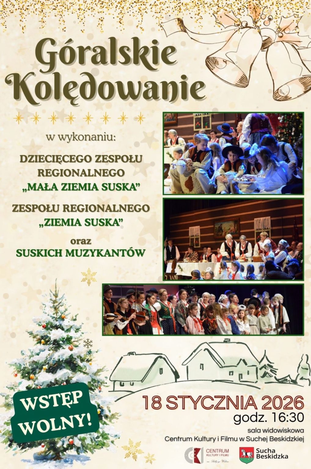 Na scenie zaprezentują się lokalne zespoły regionalne - Dziecięcy Zespół Regionalny „Mała Ziemia Suska”, Zespół Regionalny „Ziemia Suska” oraz Suscy Muzykanci. Artyści zaproszą publiczność w wyjątkową, świąteczną podróż, prezentując tradycyjne góralskie kolędy, pastorałki oraz piosenki bożonarodzeniowe, głęboko zakorzenione w kulturze regionu.