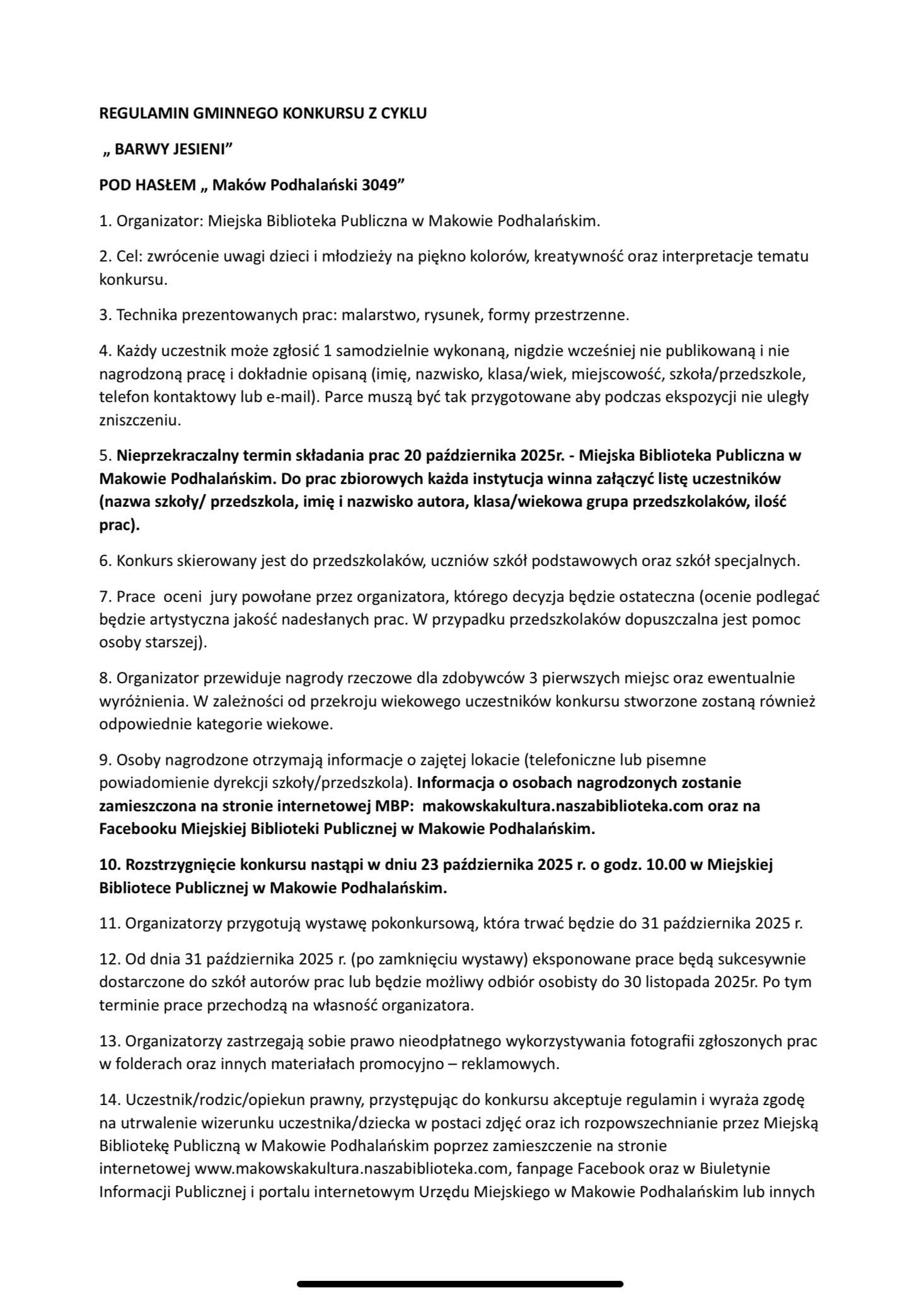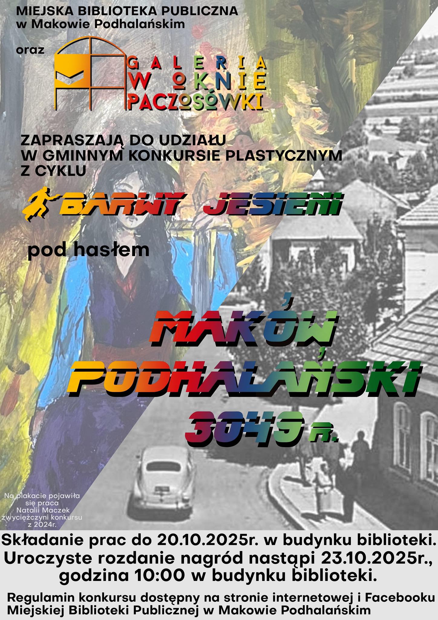 Konkurs skierowany jest do dzieci i młodzieży – wszystkich miłośników sztuki i jesiennej wyobraźni. Prace można składać w Miejskiej Bibliotece Publicznej w Makowie Podhalańskim do 20 października 2025 r.