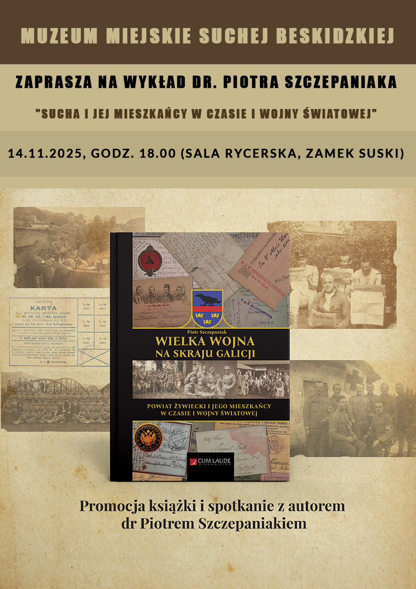 Muzeum Miejskie Suchej Beskidzkiej serdecznie zaprasza wszystkich miłośników historii regionu, pasjonatów dziejów Galicji i osoby zainteresowane losami mieszkańców Suchej Beskidzkiej w czasie I wojny światowej.