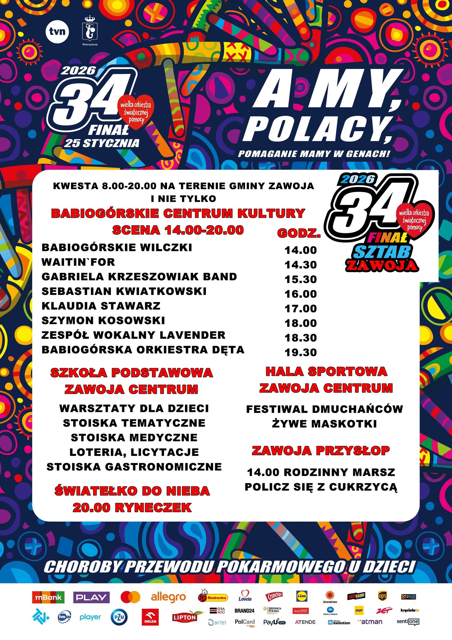 Od wczesnych godzin porannych na terenie gminy Zawoja i okolic prowadzone będą zbiórki, kwestowanie potrwa w godzinach 8.00–20.00. Kulminacją dnia będzie bogaty program artystyczny i rodzinny, przygotowany przez Sztab WOŚP Zawoja we współpracy z lokalnymi instytucjami, artystami i wolontariuszami.