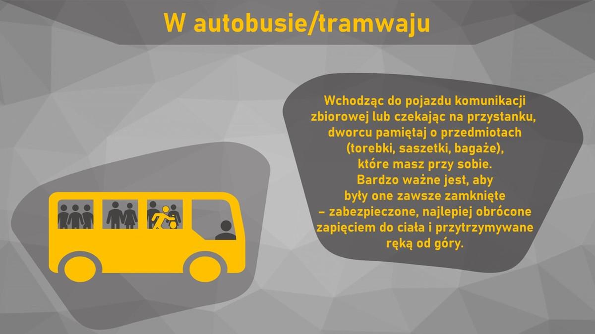 Czekając na przystanku lub podróżując komunikacją miejską, pilnuj swoich rzeczy osobistych – torebek, plecaków, saszetek czy bagażu. Przedmioty te powinny być zawsze zamknięte, najlepiej noszone z zapięciem skierowanym do ciała i przytrzymywane ręką.