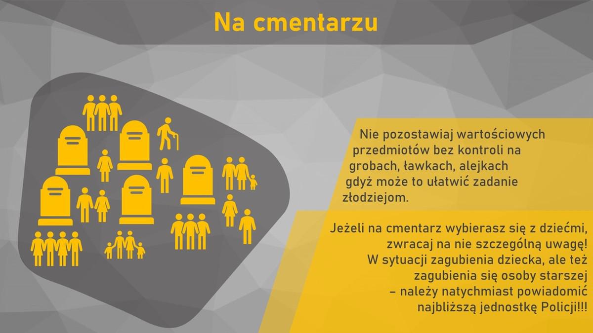 W przypadku zagubienia dziecka lub osoby starszej niezwłocznie powiadom Policję lub funkcjonariuszy obecnych w rejonie cmentarza.