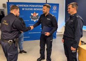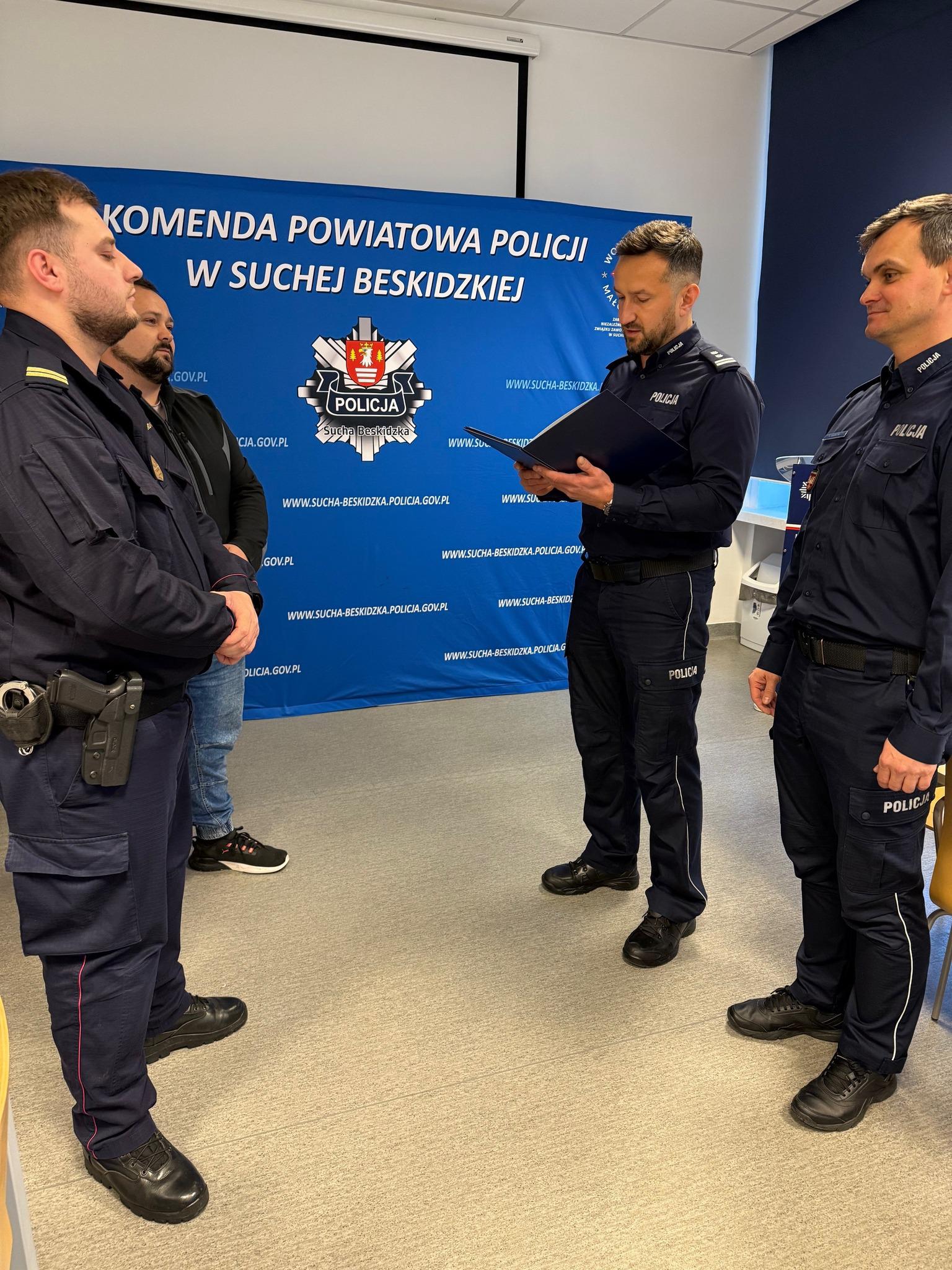 Podczas uroczystego wręczenia podziękowań Komendant Powiatowy Policji w Suchej Beskidzkiej podkreślił, jak istotną rolę odgrywa odwaga cywilna oraz reagowanie na sytuacje, w których zagrożone jest zdrowie lub życie innych osób. Zaznaczył również, że takie postawy budują poczucie bezpieczeństwa w lokalnej społeczności i są przykładem godnym naśladowania.