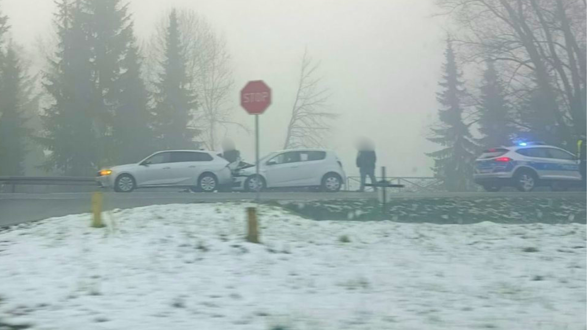Mgła i kolizja na DK28 w Suchej Beskidzkiej. Trudne warunki na drodze