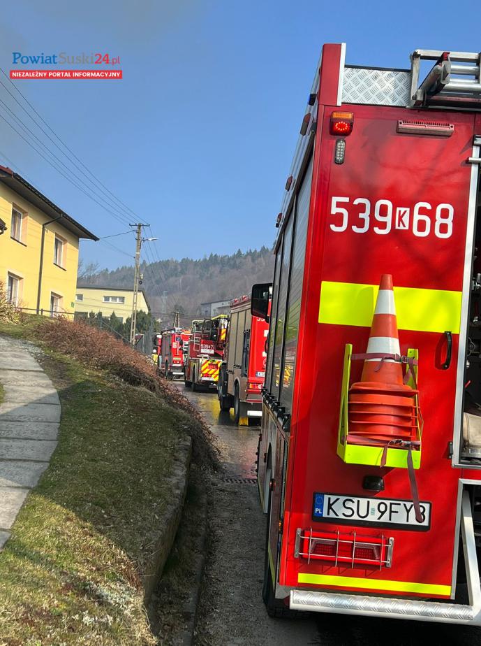 Na miejsce natychmiast zadysponowano liczne zastępy straży pożarnej oraz zespół ratownictwa medycznego z Suchej Beskidzkiej. Po przybyciu pierwszych jednostek okazało się, że ogień jest już w rozwiniętej fazie i obejmuje znaczną część budynku. Strażacy przystąpili do intensywnych działań gaśniczych oraz zabezpieczenia terenu.