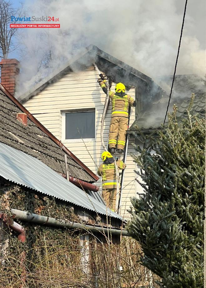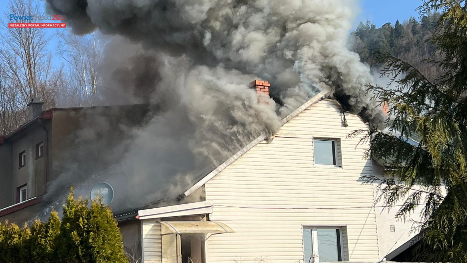 Pożar budynku mieszkalnego w Suchej Beskidzkiej. Na miejscu liczne zastępy straży pożarnej.