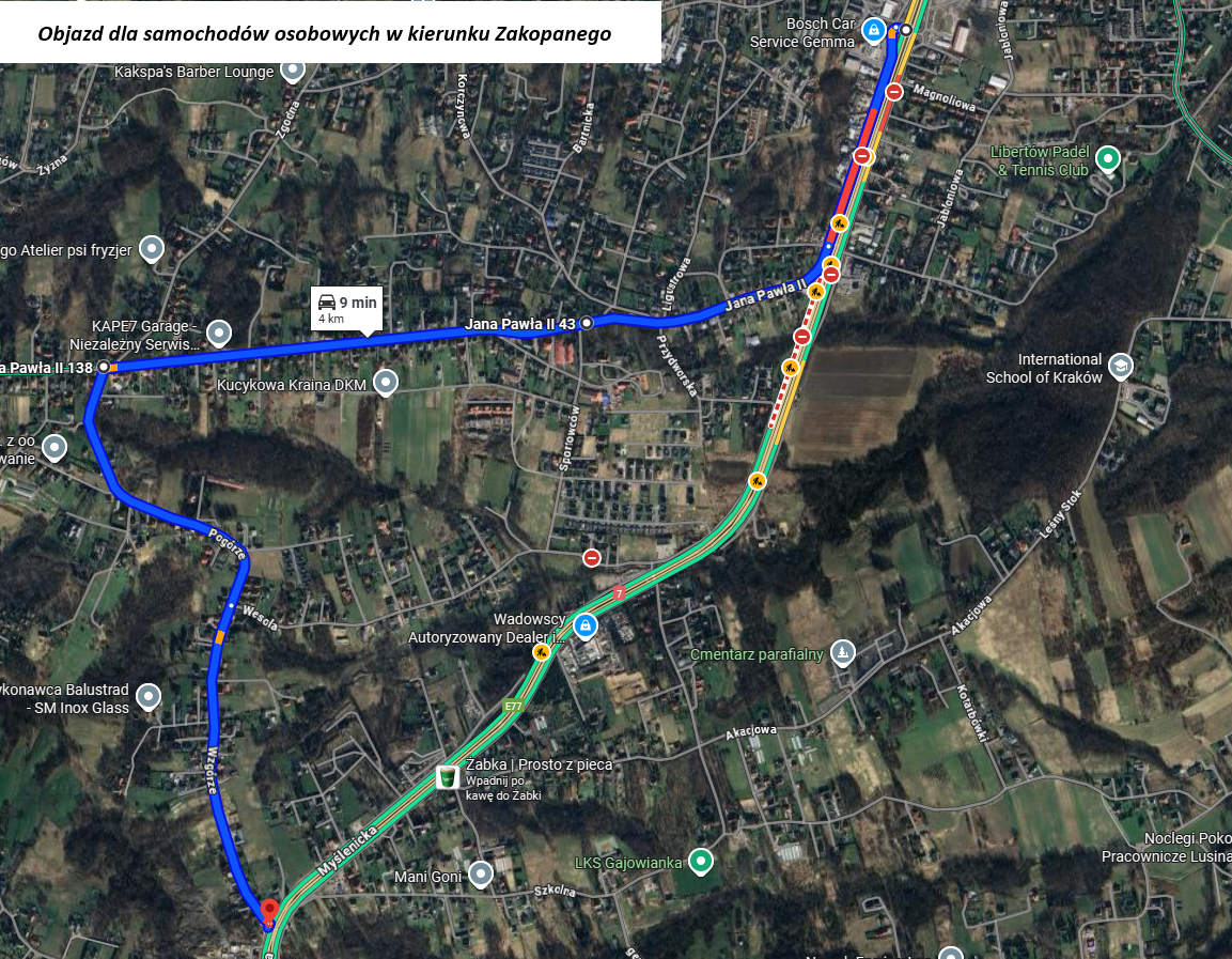 Z ulicy Myślenickiej (DK-7) należy skręcić w ulicę Wesołą, następnie w ulicę Wzgórze, co umożliwi powrót na ulicę Myślenicką z ominięciem miejsca zgromadzenia. (mapa poniżej)