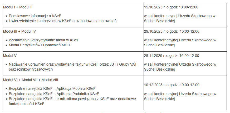 Szczegółowe informacje o terminach i sposobach uczestnictwa w szkoleniach są publikowane na stronach urzędów skarbowych, izb administracji skarbowej oraz na stronie ksef.podatki.gov.pl.