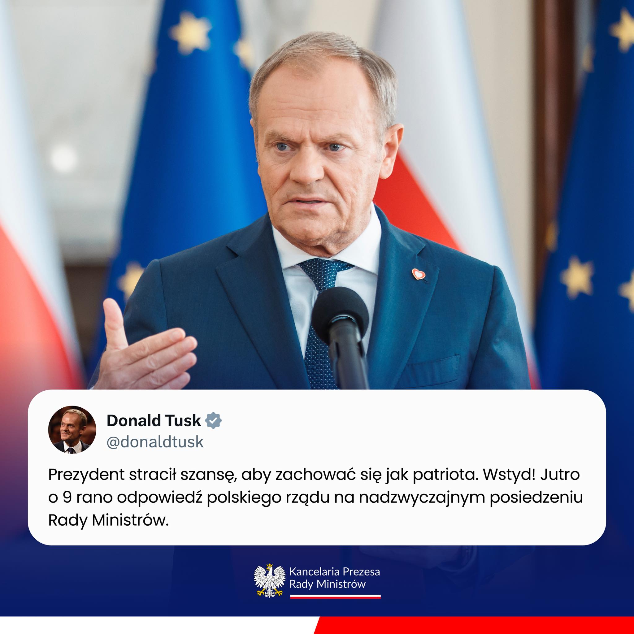 Decyzja prezydenta spotkała się z ostrą reakcją rządu. Premier Donald Tusk w mediach społecznościowych napisał, że „prezydent stracił szansę, aby zachować się jak patriota”, zapowiadając jednocześnie, że stanowisko rządu zostanie przedstawione podczas nadzwyczajnego posiedzenia Rady Ministrów.