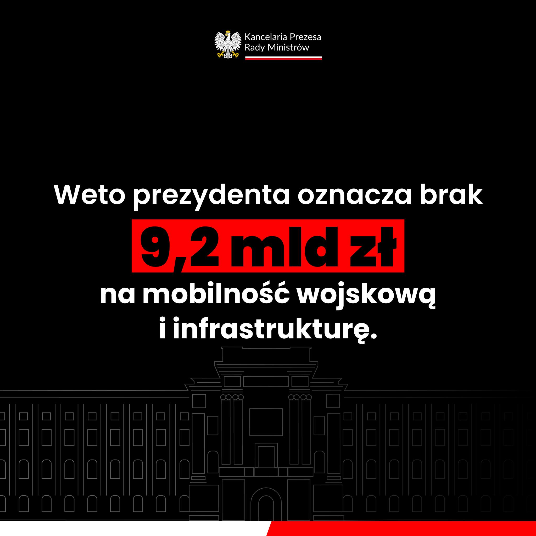 Do sprawy odniosła się także Kancelaria Prezesa Rady Ministrów, publikując w mediach społecznościowych grafiki krytykujące decyzję głowy państwa. Według jednego z komunikatów weto prezydenta oznacza brak około 9,2 miliarda złotych na mobilność wojskową i infrastrukturę.