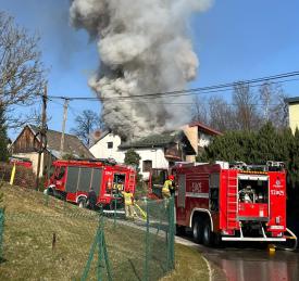 Na miejsce natychmiast zadysponowano liczne zastępy straży pożarnej oraz zespół ratownictwa medycznego z Suchej Beskidzkiej. Po przybyciu pierwszych jednostek okazało się, że ogień jest już w rozwiniętej fazie i obejmuje znaczną część budynku. Strażacy przystąpili do intensywnych działań gaśniczych oraz zabezpieczenia terenu.