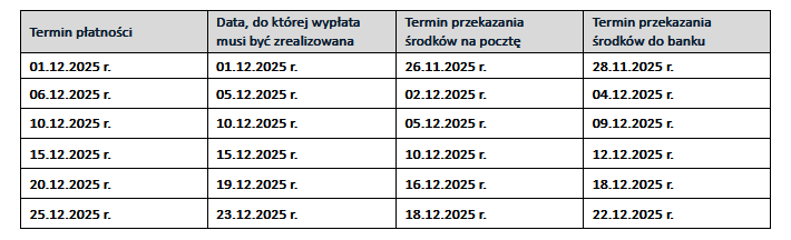 Termin wypłat emerytur i rent w grudniu 2025 r. oraz terminy przekazania środków na pocztę i do banku.