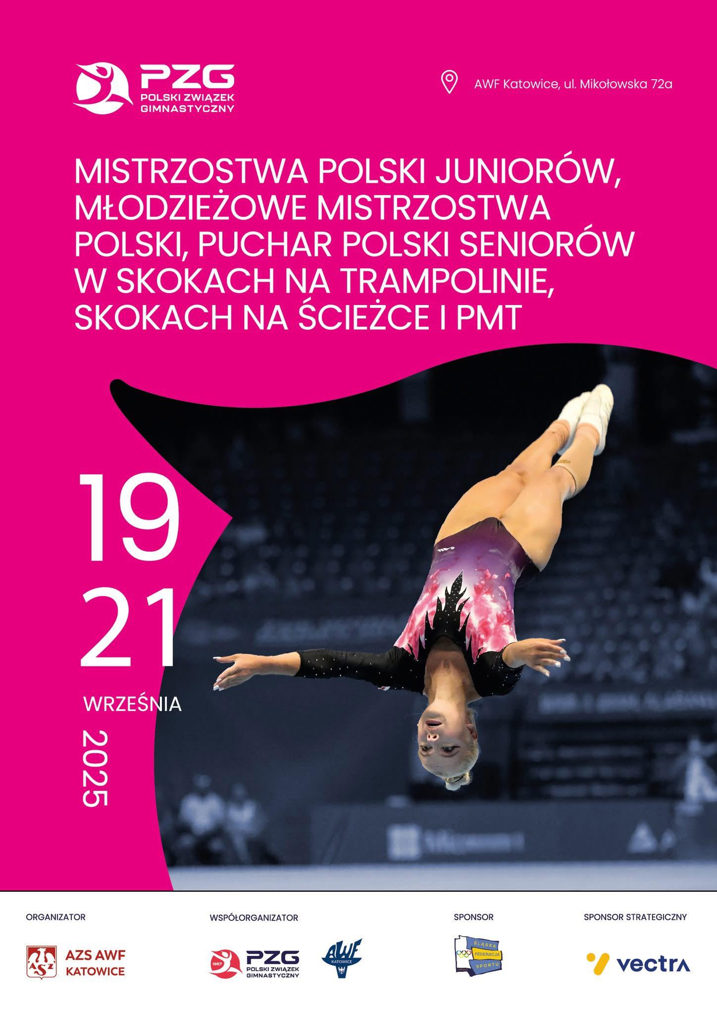 W dniach 20–21 września 2025 roku w Hali Sportowej AWF w Katowicach odbyły się Mistrzostwa Polski Juniorów oraz Młodzieżowe Mistrzostwa Polski w skokach na trampolinie, skokach na ścieżce akrobatycznej i podwójnej mini trampolinie. W zawodach udział wzięli zawodnicy reprezentujący 32 kluby z całej Polski, w tym najlepsi młodzi sportowcy i medalistki Mistrzostw Europy Juniorów 2024.