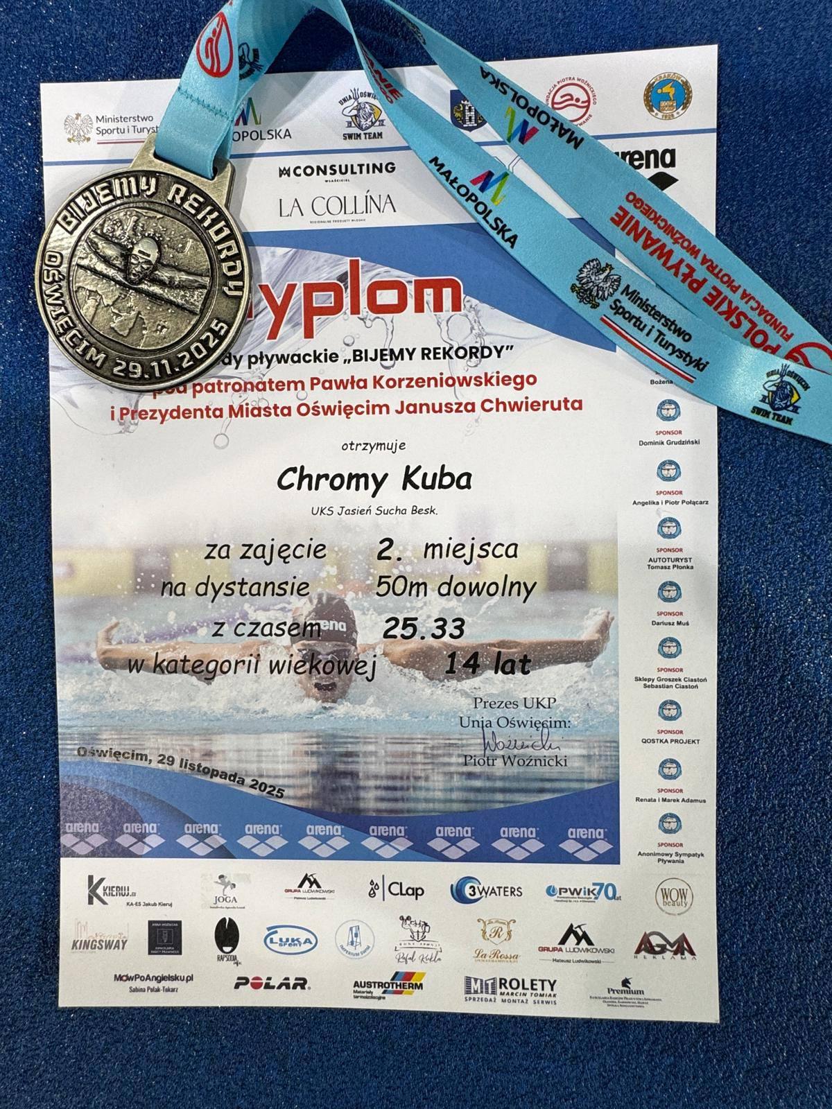 Świetny występ odnotował również Kuba Chromy (14 lat), zdobywając dwa srebra – na 50 m stylem dowolnym i 50 m stylem grzbietowym – oraz dwa brązowe medale w konkurencjach 100 m stylem zmiennym i 100 m stylem dowolnym.