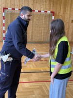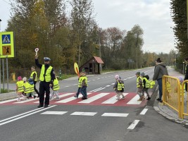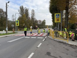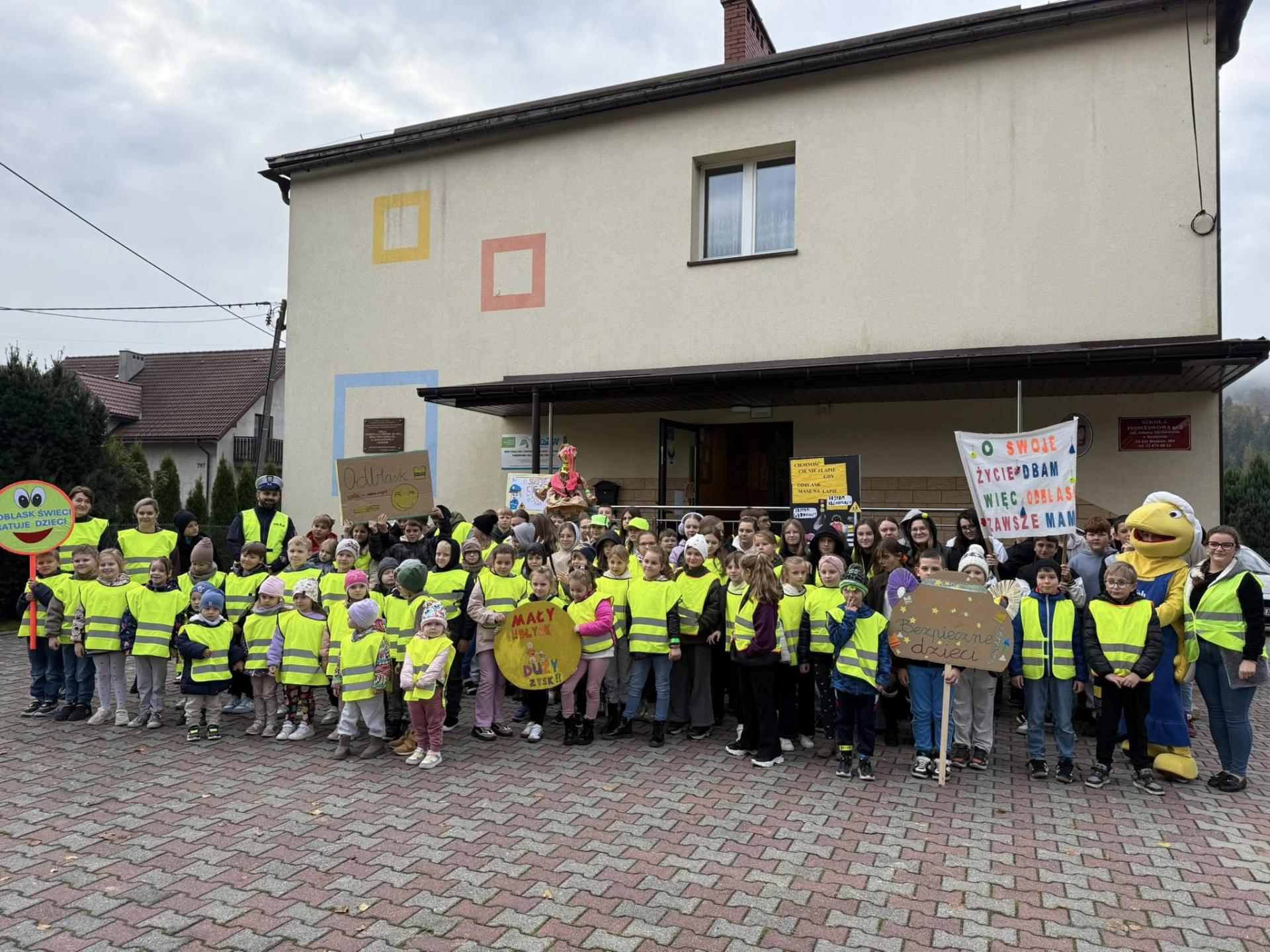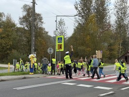 Na zakończenie wydarzenia funkcjonariusz Szymon zadbał o bezpieczeństwo uczniów, przeprowadzając ich przez przejście dla pieszych przed szkołą. Cała społeczność szkolna wyruszyła następnie w symboliczną „promenadę odblaskową”, promując ideę bezpiecznego poruszania się po drogach oraz noszenia odblasków.