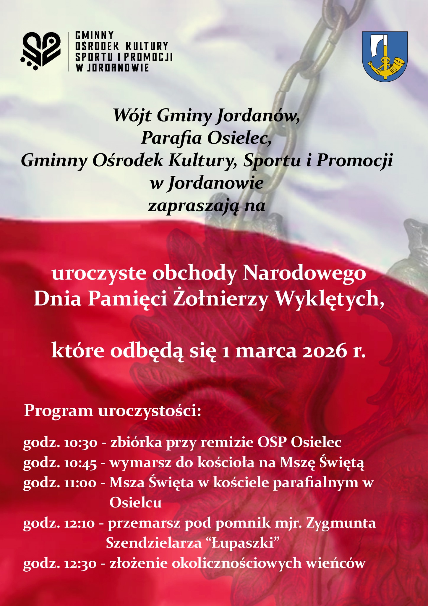 1 marca 2026 roku w Osielcu odbędą się uroczyste obchody Narodowego Dnia Pamięci Żołnierzy Wyklętych. Wydarzenie organizują Wójt Gminy Jordanów, Parafia Osielec oraz Gminny Ośrodek Kultury, Sportu i Promocji w Jordanowie.