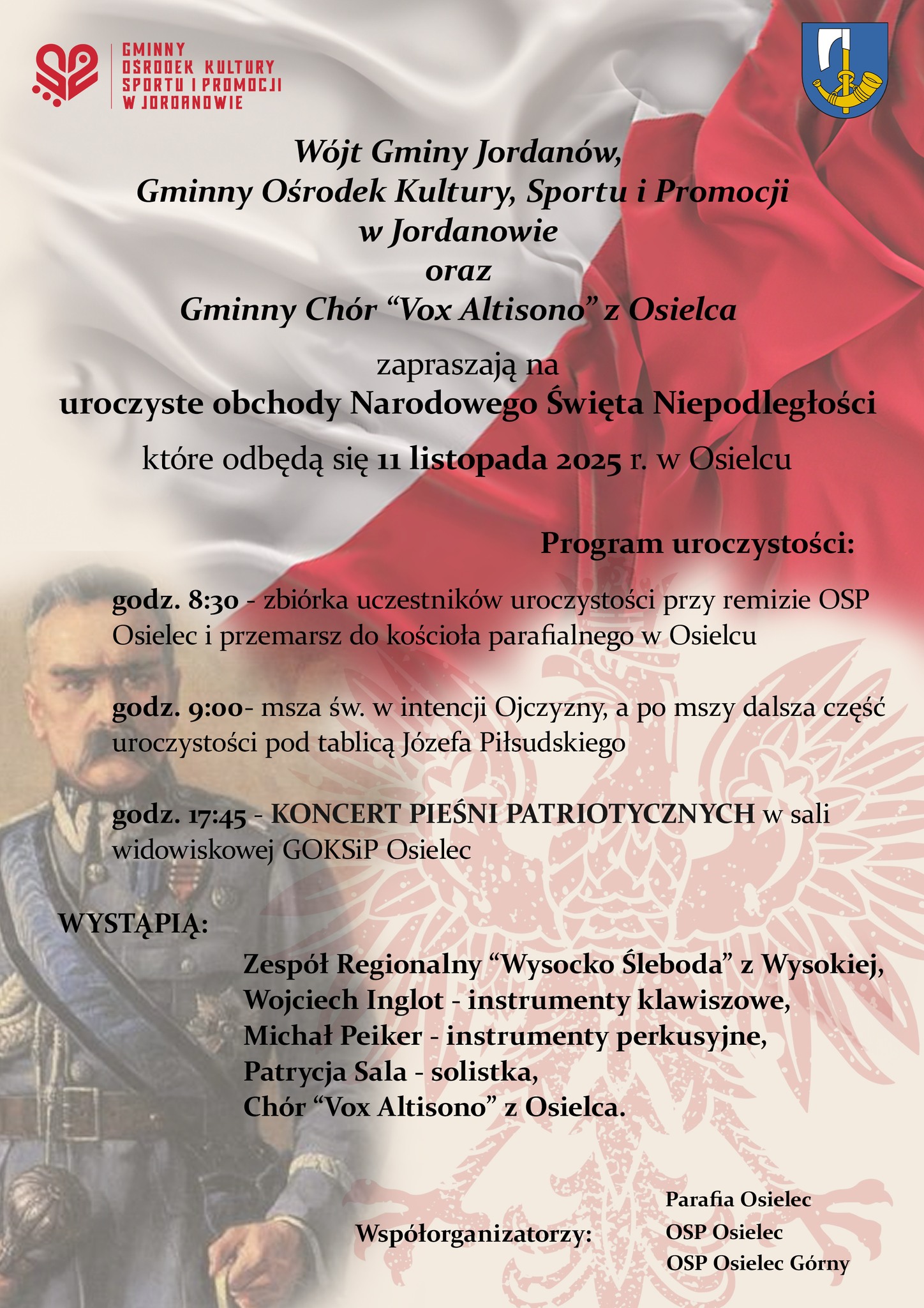 Wieczorem, o godzinie 17:45, w sali widowiskowej GOKSiP w Osielcu odbędzie się Koncert Pieśni Patriotycznych, podczas którego wystąpią:
