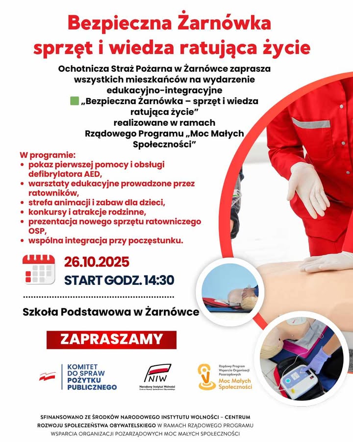 Celem wydarzenia jest podniesienie świadomości społecznej w zakresie udzielania pierwszej pomocy oraz zaprezentowanie nowoczesnego sprzętu ratowniczego, który trafił na wyposażenie OSP Żarnówka. W programie przewidziano m.in.: