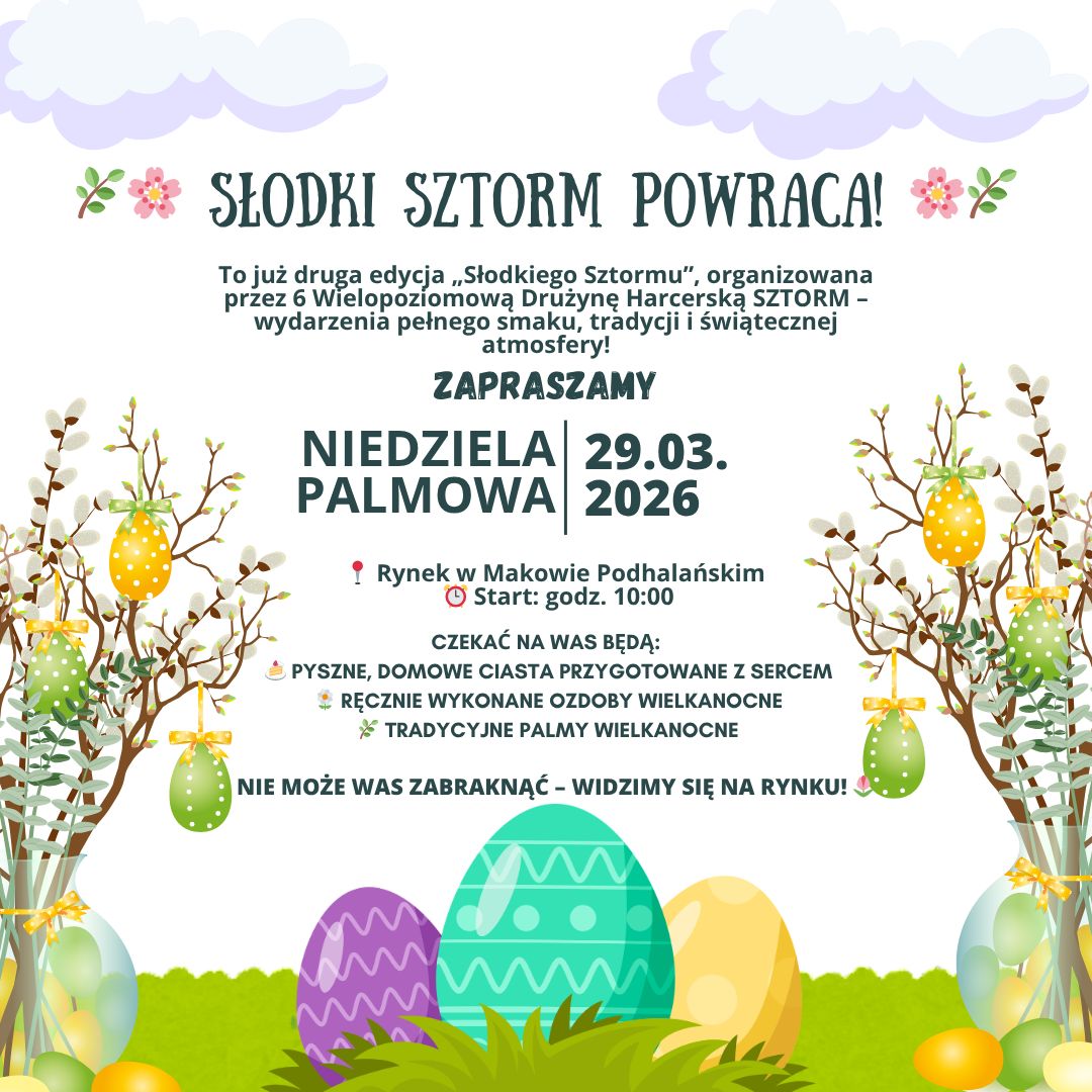 Już w najbliższą niedzielę, 29 marca 2026 roku, Rynek w Makowie Podhalańskim ponownie wypełni się zapachem domowych wypieków i świąteczną atmosferą. Wszystko za sprawą drugiej edycji wydarzenia „Słodki Sztorm”, organizowanego przez 6 Wielopoziomową Drużynę Harcerską SZTORM.