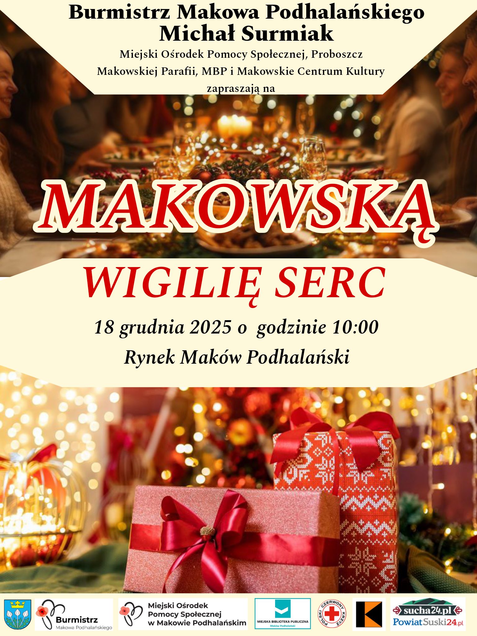 Burmistrz Makowa Podhalańskiego Michał Surmiak wraz z: Miejskim Ośrodkiem Pomocy Społecznej, Proboszczem Makowskiej Parafii, Miejską Biblioteką Publiczną, oraz Makowskim Centrum Kultury serdecznie zapraszają wszystkich mieszkańców i gości na wyjątkowe, pełne ciepła i wspólnoty wydarzenie.
