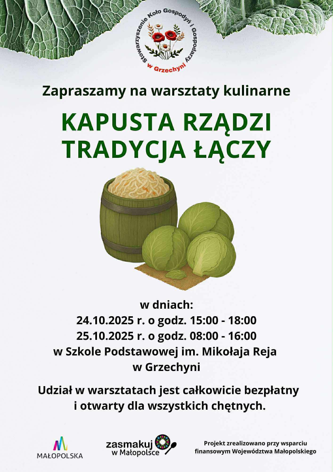 Podczas warsztatów uczestnicy będą mieli okazję wspólnie odkrywać sekrety potraw z kapusty – warzywa, które od pokoleń gości na polskich stołach. Spotkanie będzie doskonałą okazją do nauki, wymiany doświadczeń i wspólnego spędzenia czasu w duchu lokalnej tradycji.