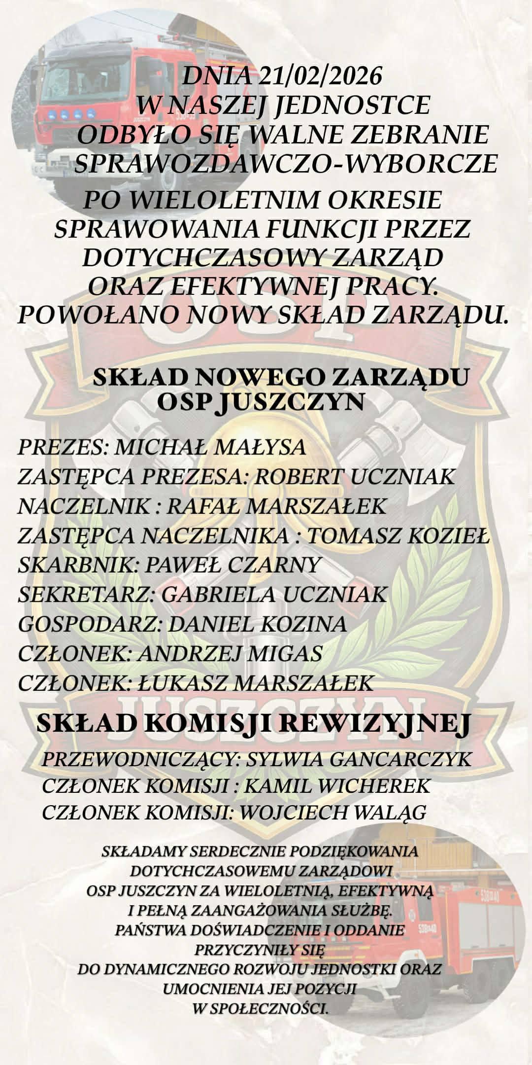 Słowa uznania skierowano również do wszystkich członków ustępującego Zarządu za lata służby, odpowiedzialność oraz konsekwentne budowanie silnej i dobrze zorganizowanej struktury OSP w Juszczynie. Podziękowano także druhnom, druhom oraz zaproszonym gościom za liczną obecność i aktywny udział w zebraniu. Jak podkreślano, tak duże zaangażowanie jest wyrazem wsparcia i motywacją do dalszej pracy.