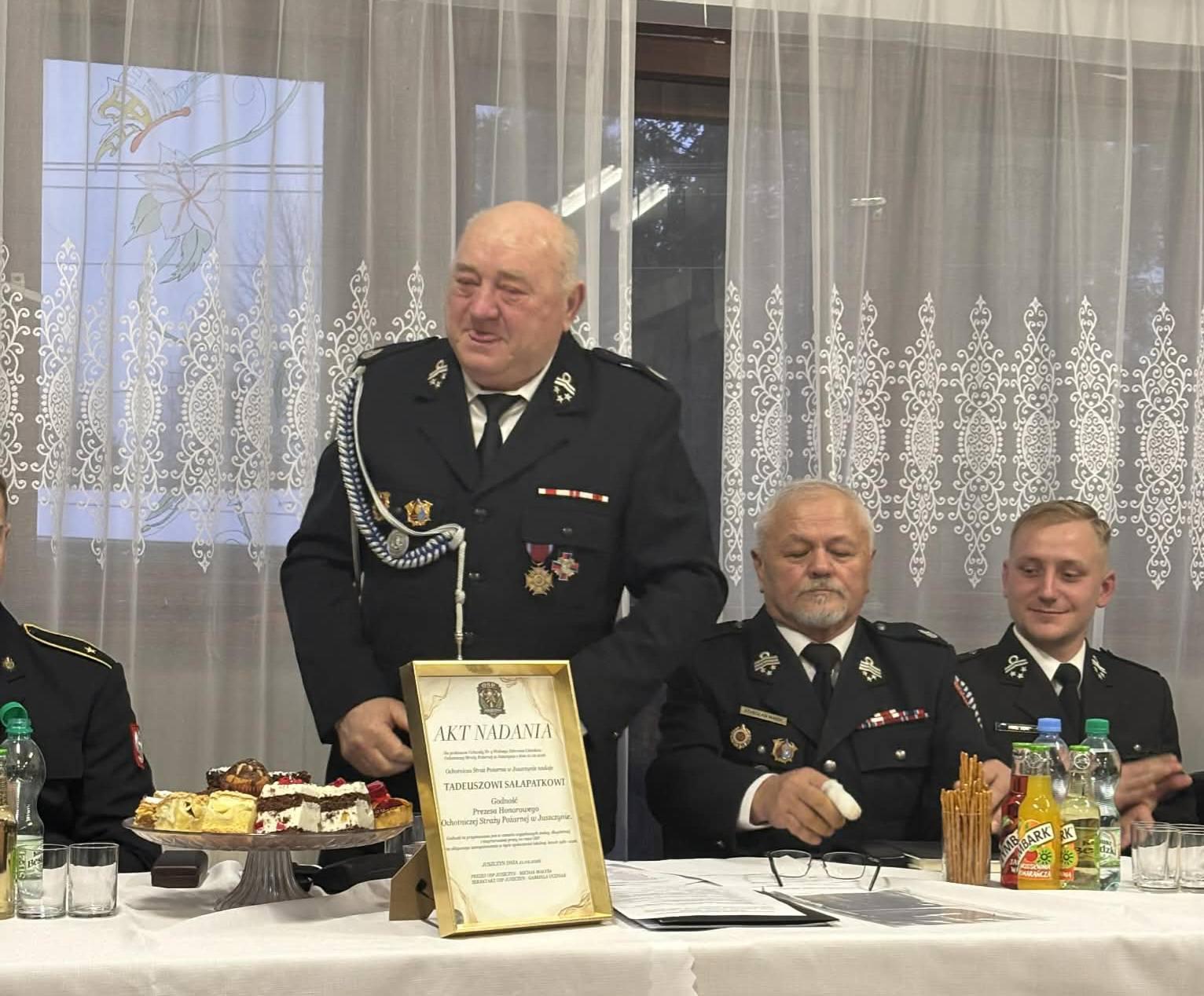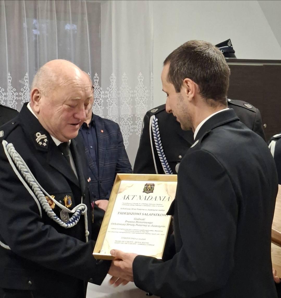 Szczególne wyrazy wdzięczności skierowano do ustępującego Prezesa, dh. Tadeusza Sałapatka, oraz Naczelnika, dh. Andrzeja Wicherka. Podkreślano ich wieloletnie zaangażowanie, wkład w rozwój jednostki, dbałość o jej gotowość bojową oraz nieustanne wsparcie dla lokalnej społeczności. Dzięki ich pracy Ochotnicza Straż Pożarna w Juszczynie umacniała swoją pozycję jako ważny filar bezpieczeństwa w miejscowości.