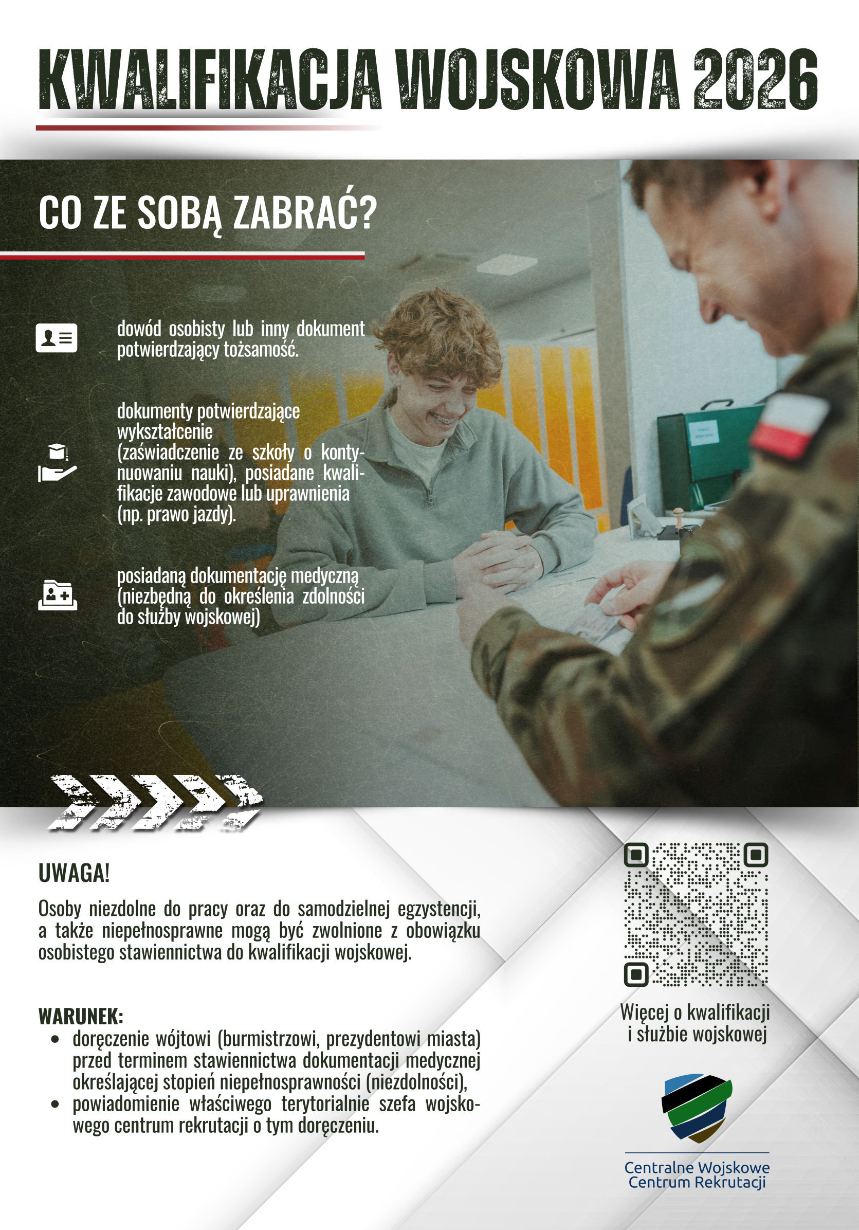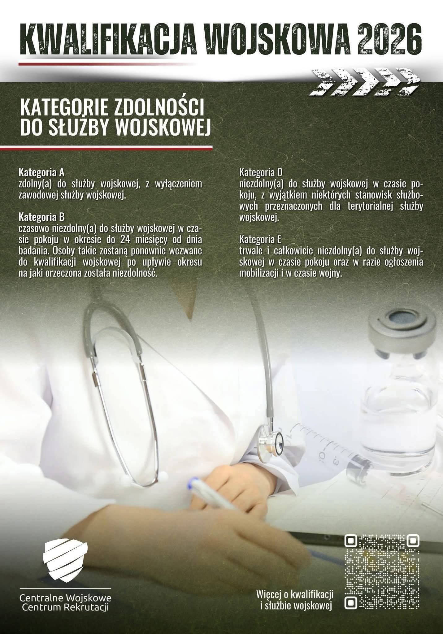 W 2026 roku kwalifikacja wojskowa na terenie całej Polski będzie przeprowadzana w terminie od 2 lutego do 30 kwietnia 2026 r. Jest to coroczne przedsięwzięcie organizowane przez administrację rządową oraz samorządową, mające na celu ustalenie zdolności obywateli do czynnej służby wojskowej oraz uzupełnienie ewidencji wojskowej. Wezwania otrzyma łącznie 235 tysięcy osób. Zasady i harmonogram zostały określone w rozporządzeniu Ministerstwa Obrony Narodowej.