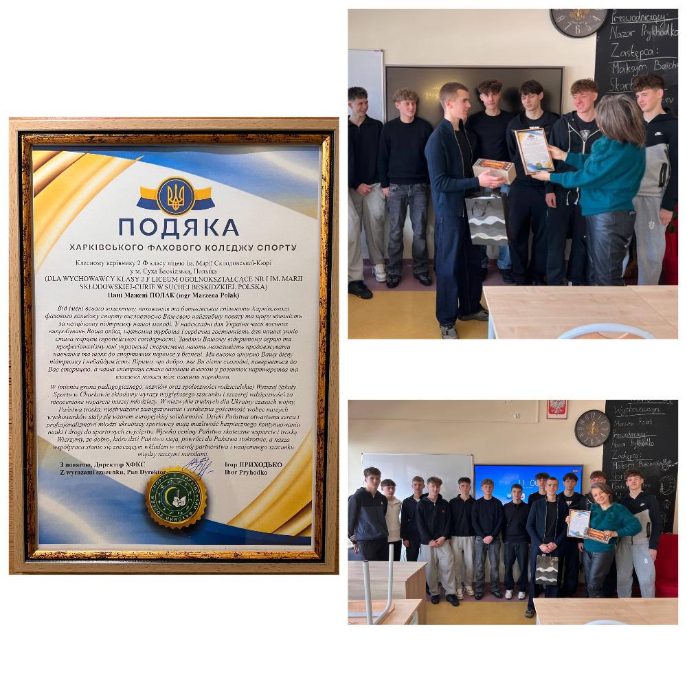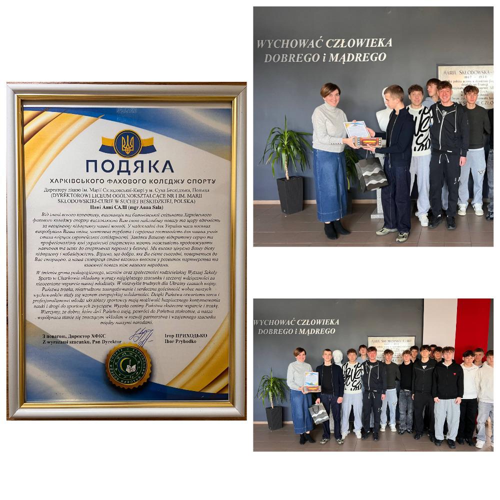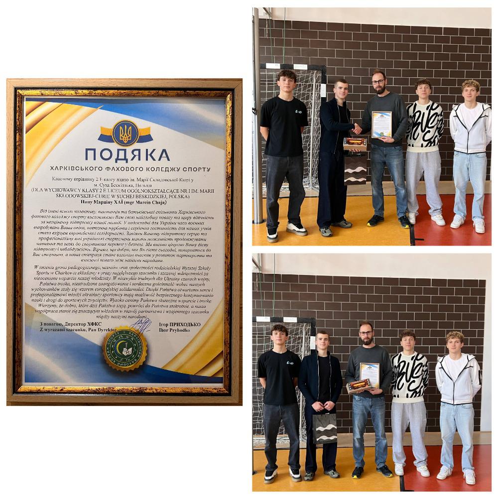 Kadra pedagogiczna, uczniowie oraz rodzice Wyższej Szkoły Sportu w Charkowie wręczyli pamiątkowe dyplomy i symboliczne upominki od miasta-bohatera Charkowa swoim partnerom z Polski: Liceum Ogólnokształcącemu nr I im. Marii Skłodowskiej-Curie w Suchej Beskidzkiej oraz Stowarzyszeniu Sportowemu „FOOTBALL CHALLENGE”. Podziękowania są wyrazem uznania za wielowymiarową pomoc udzieloną młodym Ukraińcom w jednym z najtrudniejszych okresów w historii ich kraju.