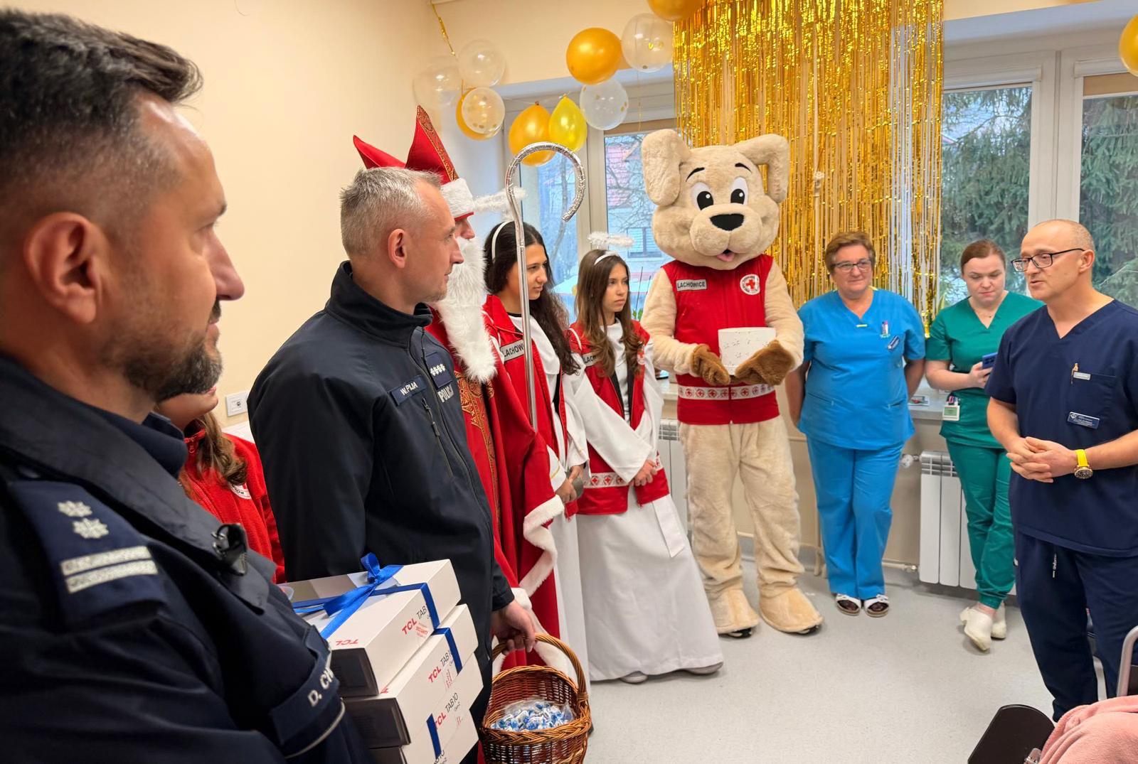 Wizyta służb mundurowych była dla dzieci ogromnym zaskoczeniem. Mali pacjenci z ciekawością i szerokimi uśmiechami obserwowali wchodzących do sal gości, którzy przynieśli ze sobą prezenty mikołajkowe przygotowane przez Zarząd Terenowy NSZZ Policjantów przy Komendzie Powiatowej Policji w Suchej Beskidzkiej. Każde dziecko otrzymało również elementy odblaskowe drobny, ale bardzo ważny upominek, który ma zwiększyć bezpieczeństwo najmłodszych po powrocie do domu.