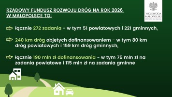 Jak poinformowało Ministerstwo Infrastruktury, w 2026 roku na realizację zadań w całym kraju przeznaczonych zostanie 2,7 mld zł. W Małopolsce wsparciem objęto 272 zadania, 51 powiatowych i 221 gminnych. Wśród nich 131 to zadania jednoroczne, pozostałe mają charakter wieloletni, w tym 85 to projekty kontynuowane, a 56 nowe zadania wieloletnie.