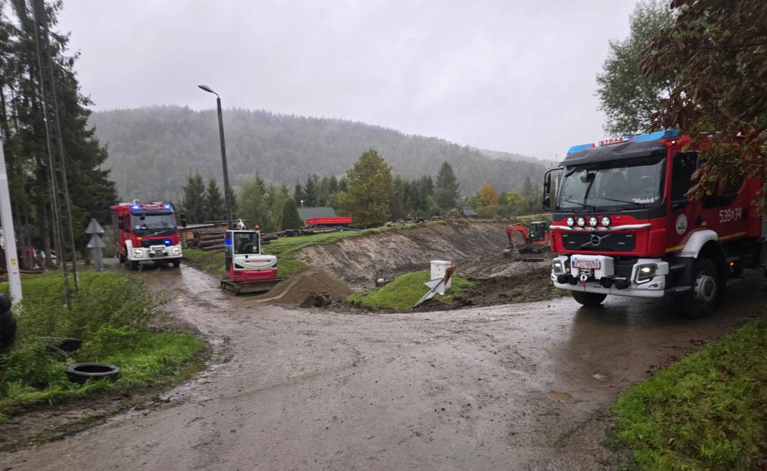 Strażacy prowadzą akcję ratunkową, jednak działania są utrudnione ze względu na trudne warunki terenowe.