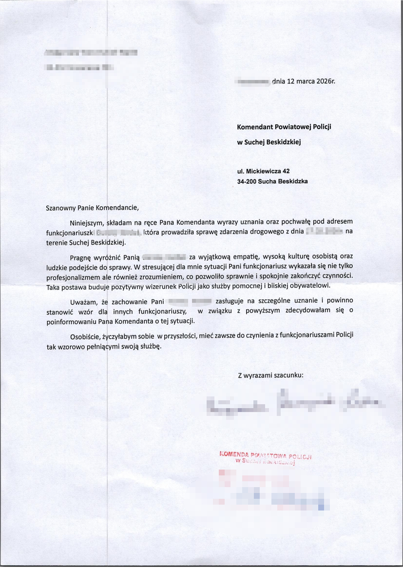 Jak podkreślają przedstawiciele komendy, takie podziękowania są szczególnie cenne. Choć policjanci nie oczekują pochwał za swoją służbę, każde dobre słowo stanowi dla nich dodatkową motywację i potwierdzenie, że ich praca ma realne znaczenie dla mieszkańców.