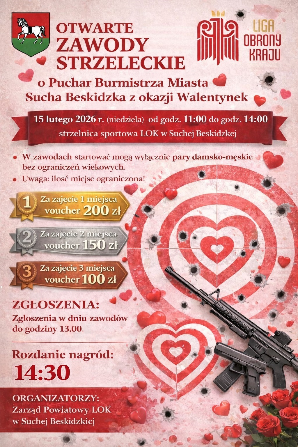 Już 15 lutego 2026 r. (niedziela) w godz. 11.00–14.00 na strzelnicy sportowej LOK przy ul. Makowskiej w Suchej Beskidzkiej (dawny kamieniołom Jasnochowa) odbędą się Otwarte Zawody Strzeleckie o Puchar Burmistrza Miasta Sucha Beskidzka z okazji Walentynek.