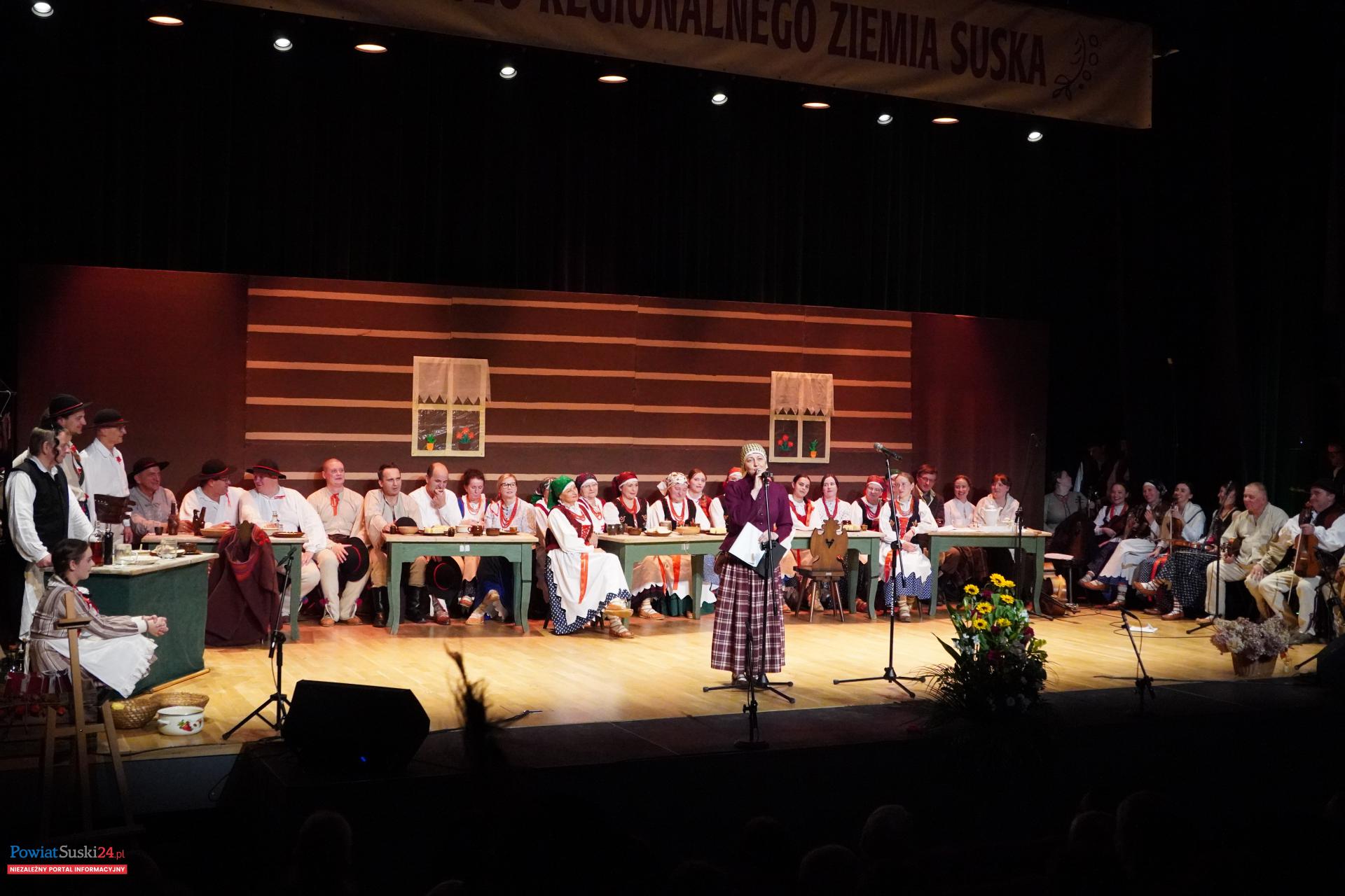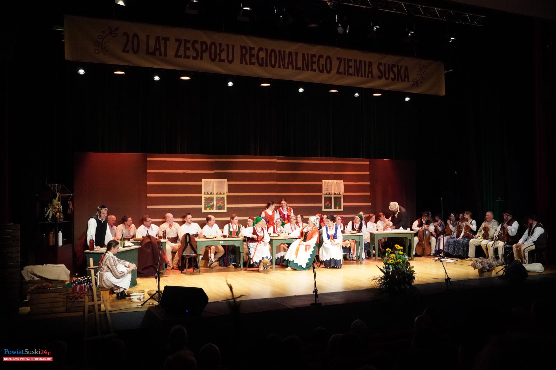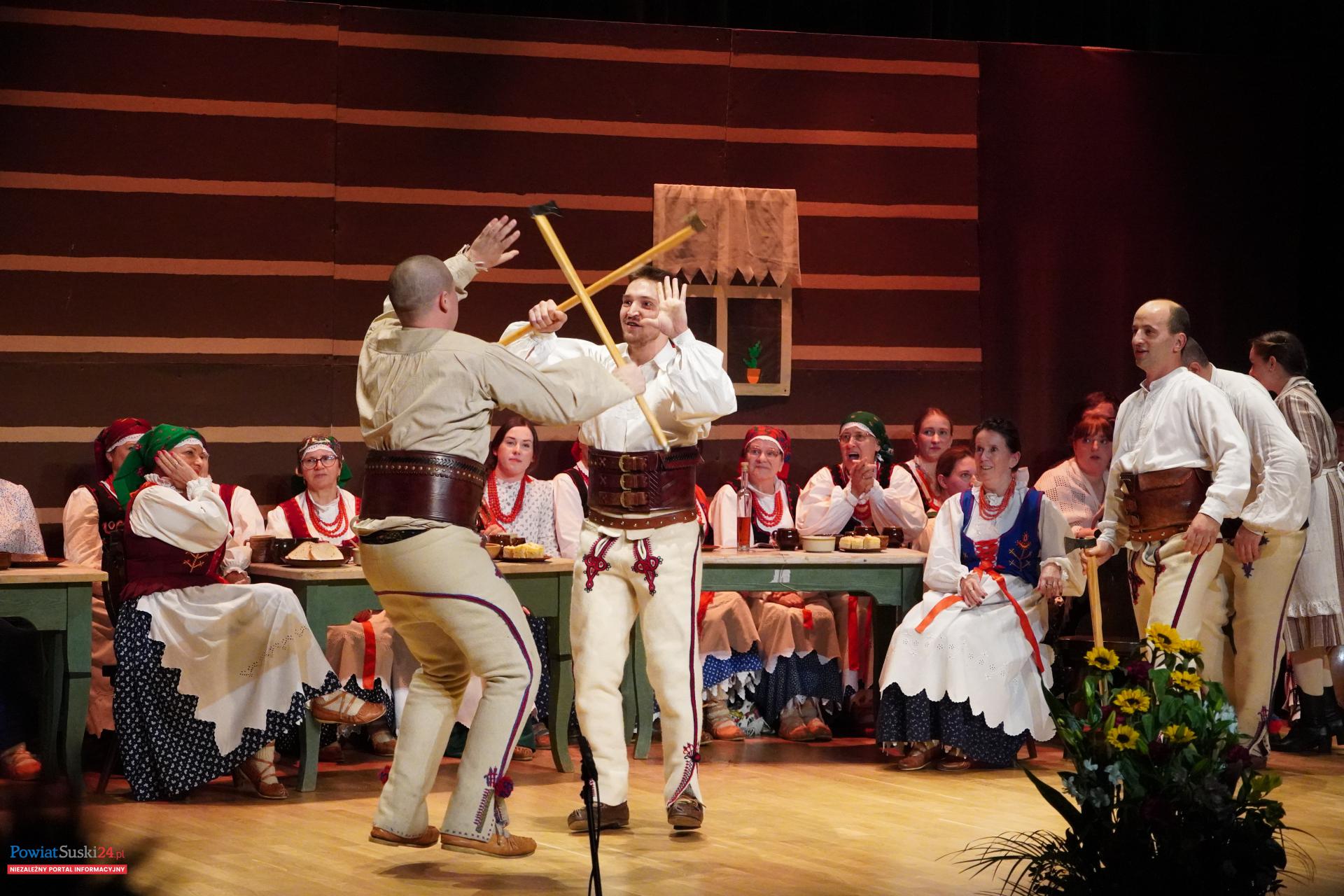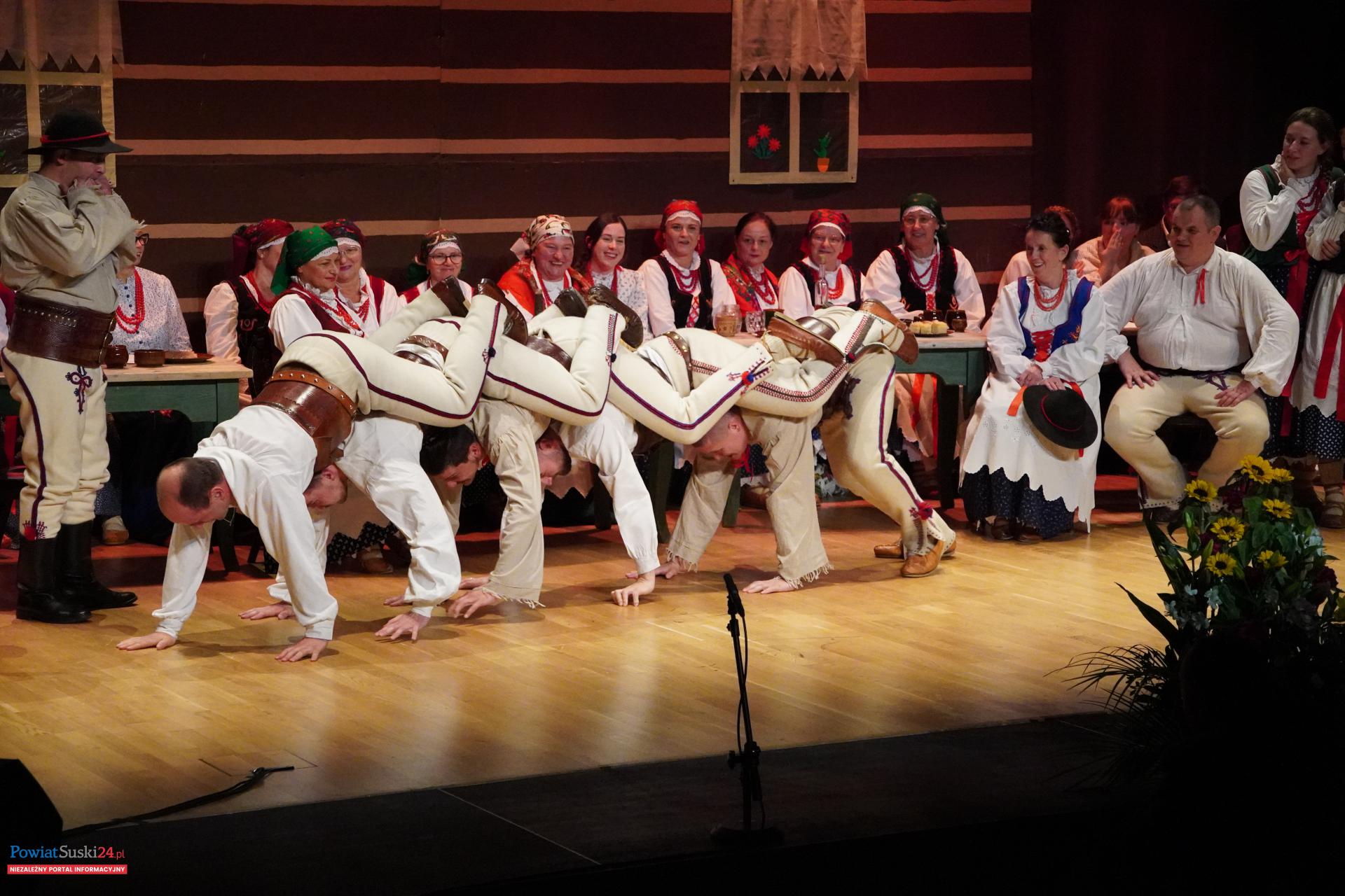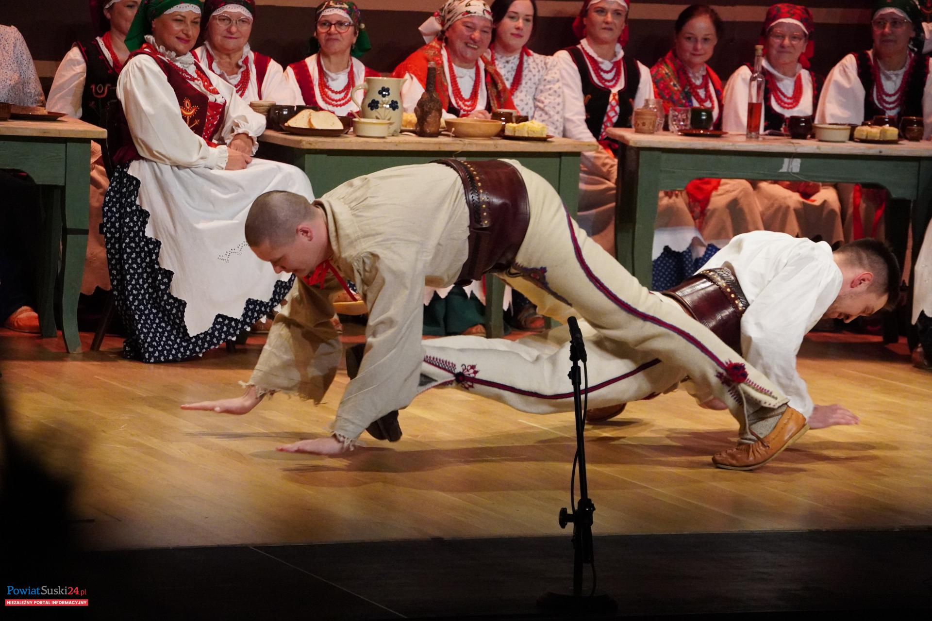 Po wystąpieniach kierowników i prezentacji osiągnięć zespołu Regina Wicher zaprosiła publiczność do obejrzenia widowiska obrzędowego. Po słowach: „A teraz przeniesiemy się do karczmy…” odsłonięto kurtynę i rozpoczął się pełen humoru i dynamiki spektakl z udziałem całego zespołu „Ziemia Suska”. Finał, w którym „pali się sopa”, wywołał żywą reakcję publiczności.