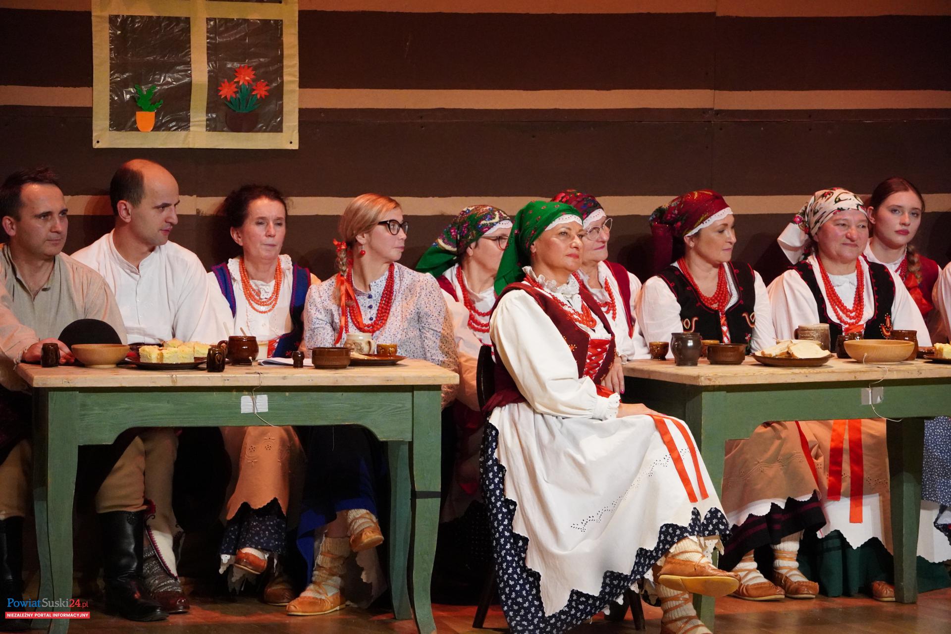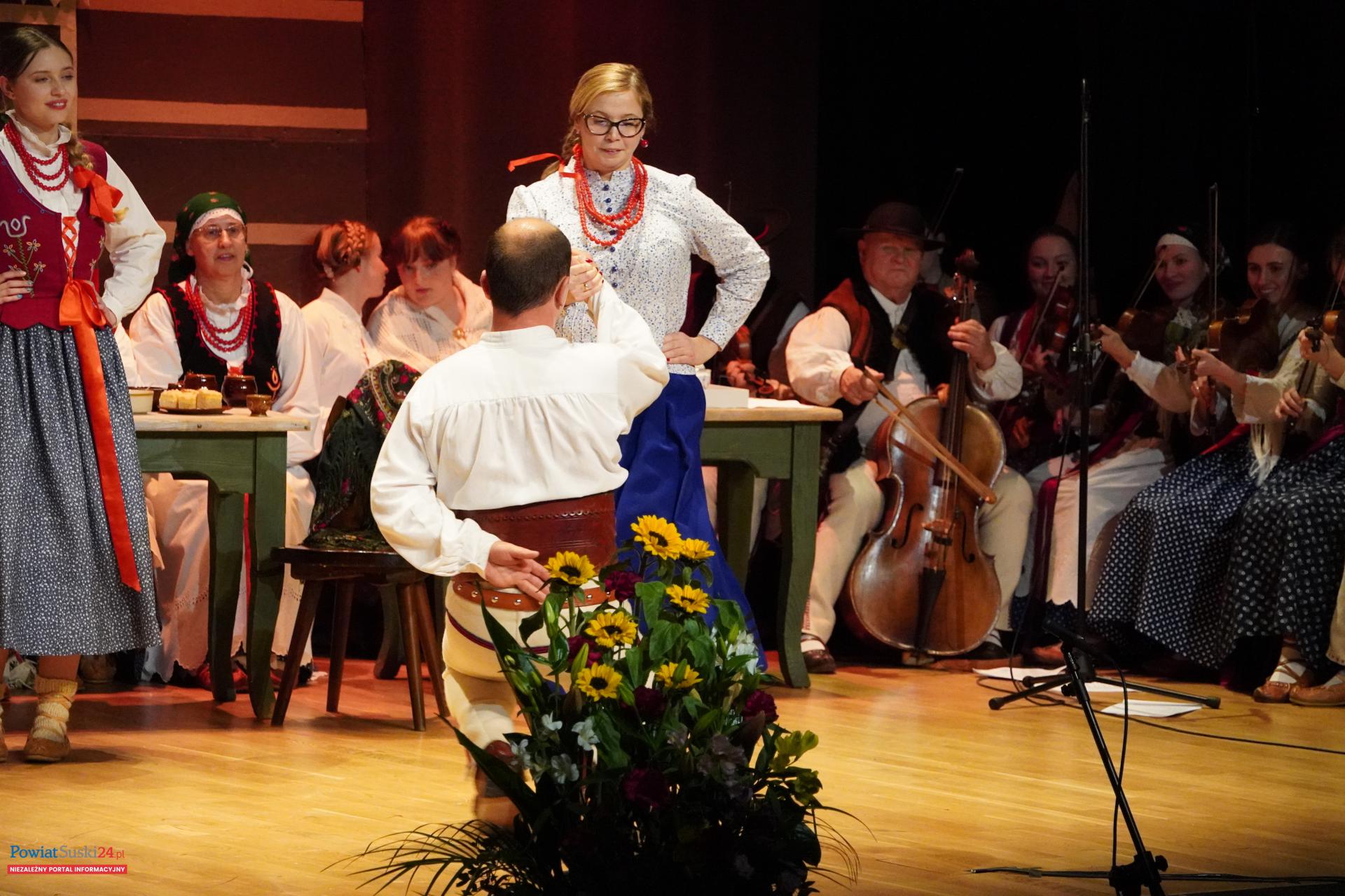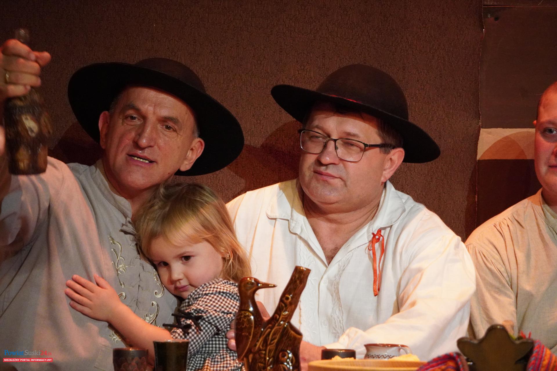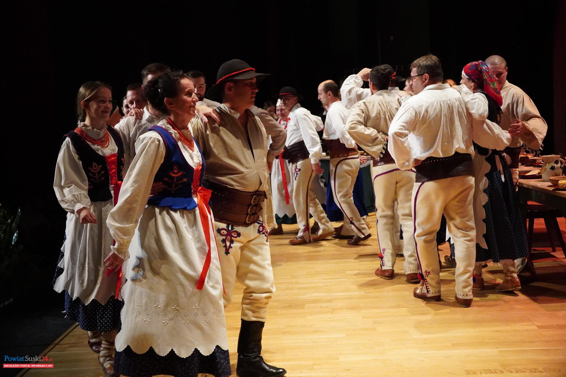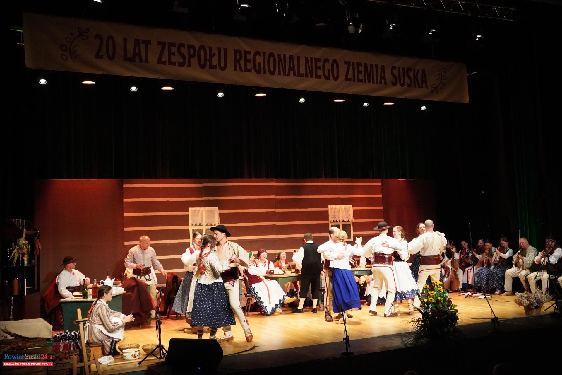 Po wystąpieniach kierowników i prezentacji osiągnięć zespołu Regina Wicher zaprosiła publiczność do obejrzenia widowiska obrzędowego. Po słowach: „A teraz przeniesiemy się do karczmy…” odsłonięto kurtynę i rozpoczął się pełen humoru i dynamiki spektakl z udziałem całego zespołu „Ziemia Suska”. Finał, w którym „pali się sopa”, wywołał żywą reakcję publiczności.