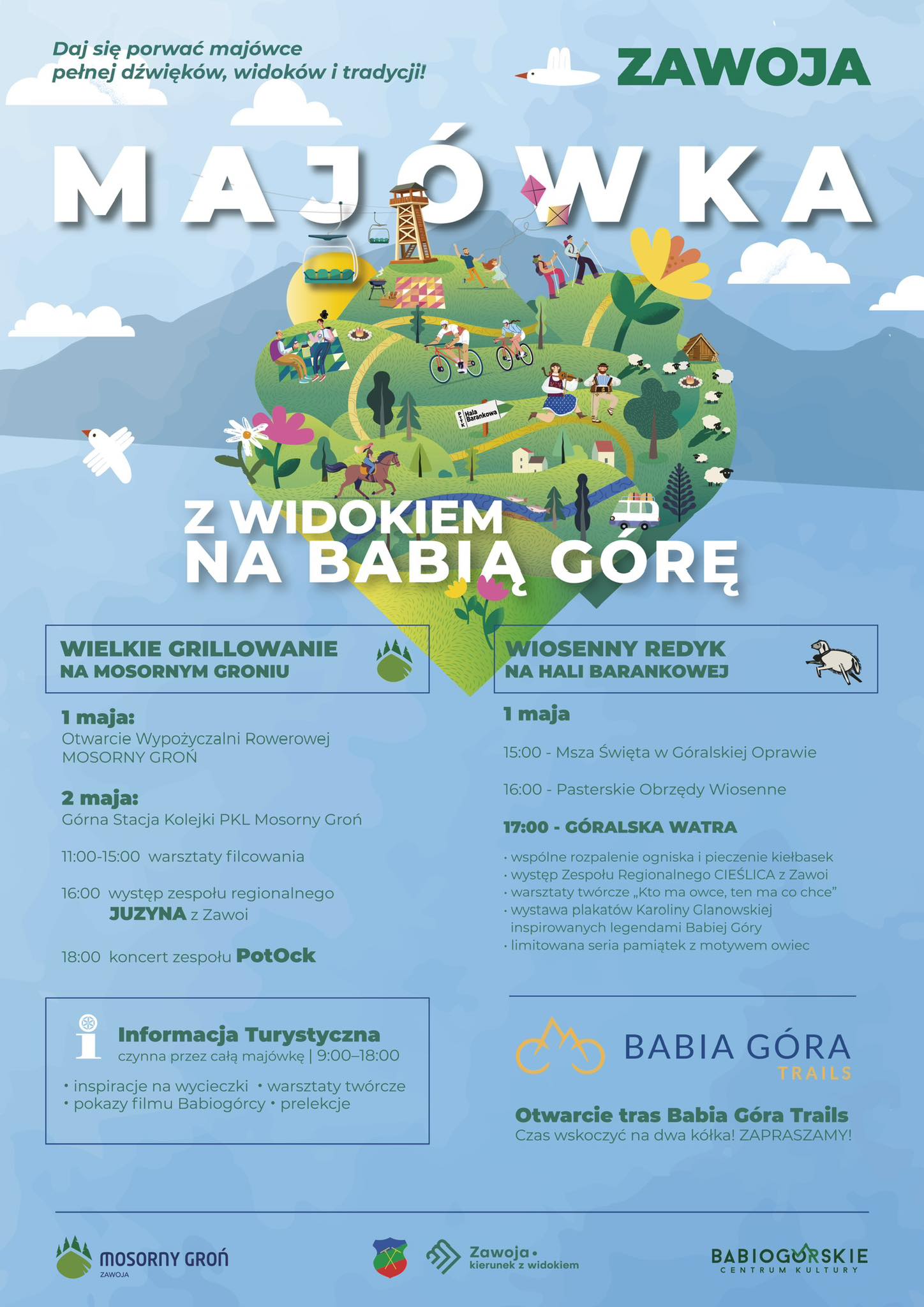 Dodatkowo przez cały okres majówki czynna będzie Informacja Turystyczna, oferująca inspiracje na wycieczki, warsztaty twórcze, pokazy filmowe oraz prelekcje związane z regionem babiogórskim.