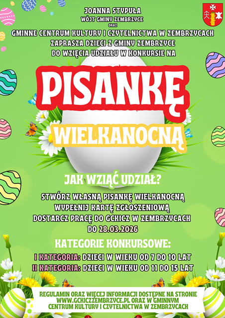 Aby wziąć udział w konkursie należy wykonać własną pisankę wielkanocną, wypełnić kartę zgłoszeniową i dostarczyć pracę do siedziby Gminnego Centrum Kultury i Czytelnictwa w Zembrzycach do dnia 28 marca 2026