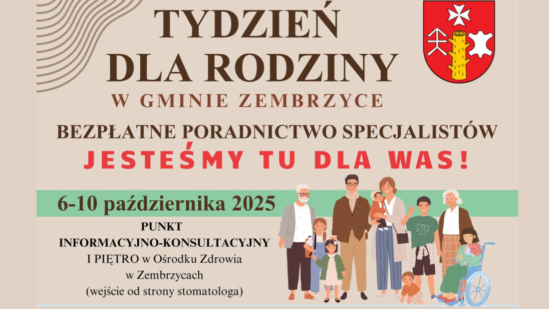Gmina Zembrzyce zaprasza wszystkich mieszkańców do udziału w kampanii „Tydzień dla rodziny”, która odbędzie się w dniach 6–10 października 2025 r. (poniedziałek–piątek).